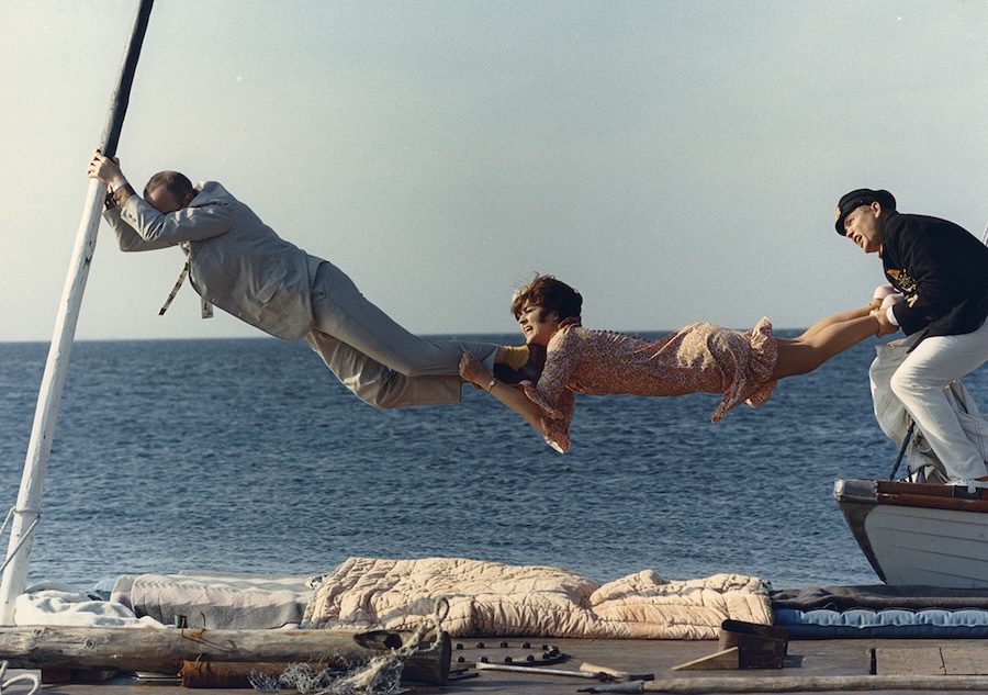 Större delen av rollistan är bekant från såväl Danielssons regidebut, Svenska bilder (1964), som Hasseåtages revyer; samtliga är mycket minnesvärda. Gösta Ekman snubblar runt som om han redan vore Papphammar. Lars Ekborgs tjurige kapten är mycket sevärd i sina dambyxor. Hans Alfredsons koleriske fiskargubbe med obegriplig skärgårdsdialekt och en ohälsosam kärlek till Esther Williams har tagit sin plats i filmhistorien. Tage Danielsson själv är den stumme, otursdrabbade direktören som hänger med på skutan. Kvinnorna har inte fått riktigt lika roande roller, men är ändå ovärderliga för filmen. Missa inte ögonblicket då Ekborg och Zetterlund dansar med varandra trots vattnet som separerar dem, samt de försök som görs att stjäla Garbos nyckel till motorbåten; Alfredson har en suverän scen där.